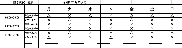 | × | 空きがありません。ヘルパー確保等は行えますが、お待ち頂く事になります。 |